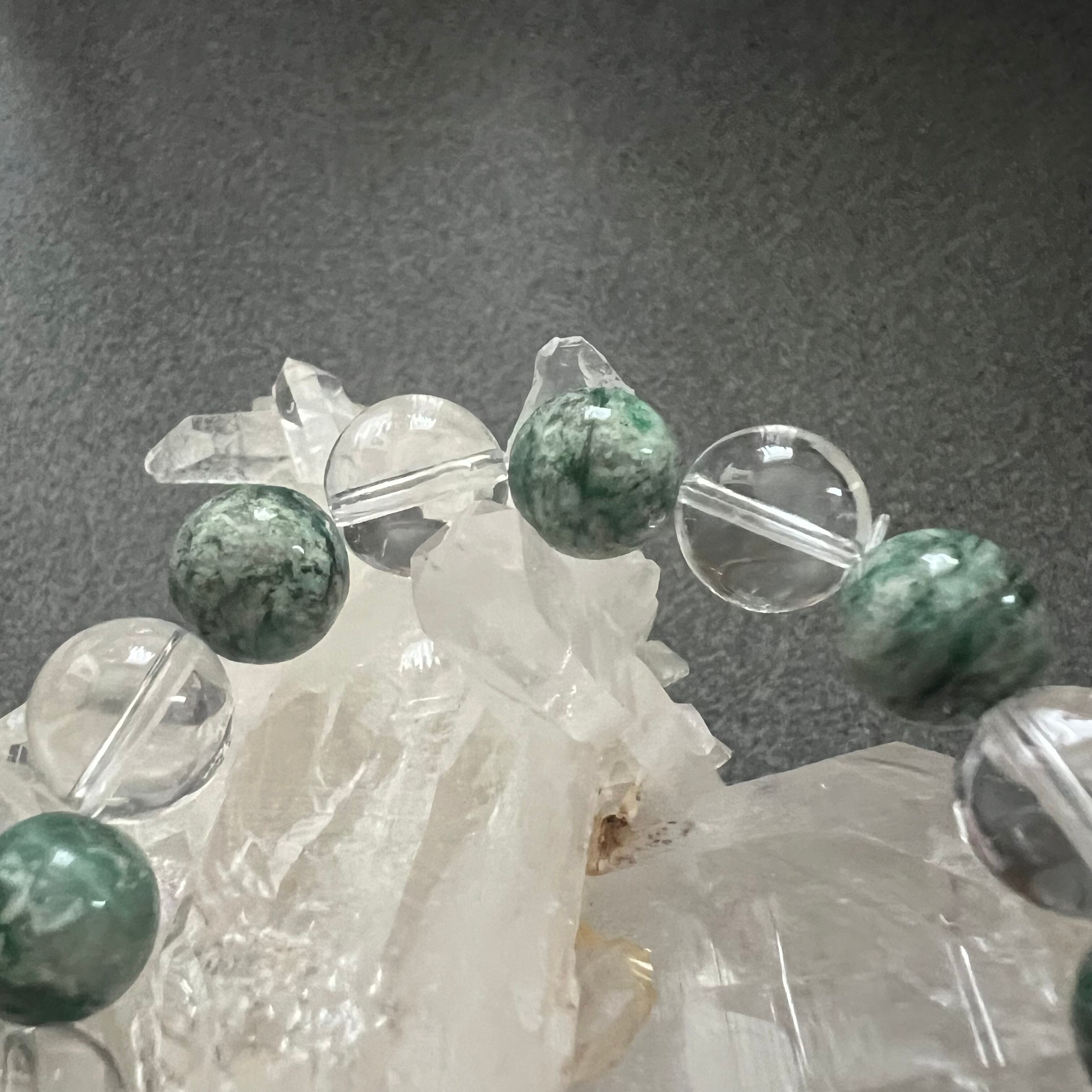 深みのあるグリーンと、柔らかなホワイトが溶け合うように流れるマーブル模様が魅力のマイカシストです。