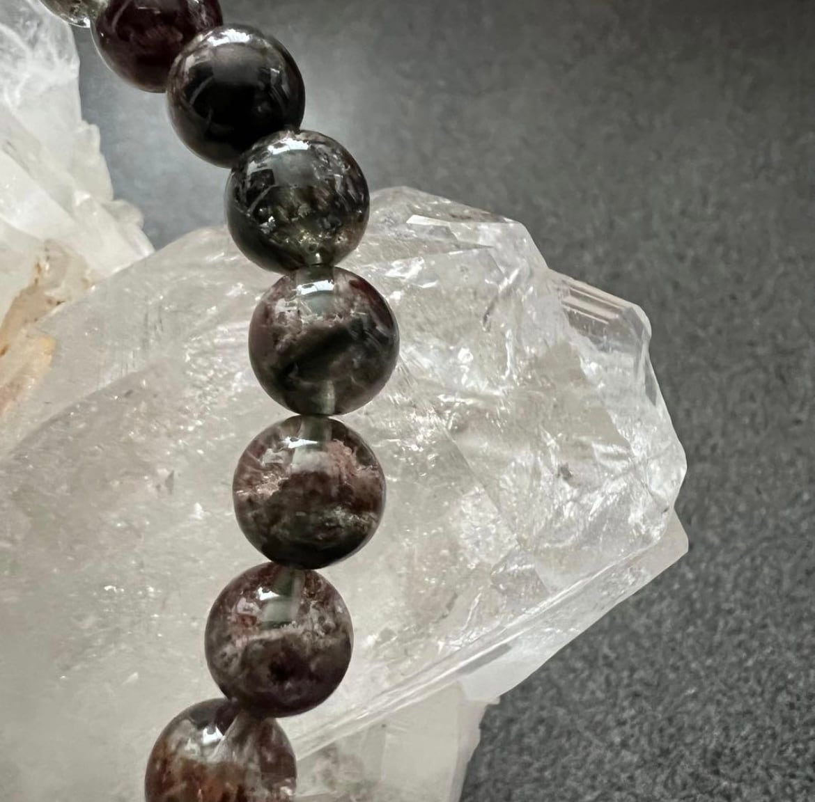 透明感のある水晶に赤と緑のガーデンが入っており、これが龍神ガーデンというブレスレット!!