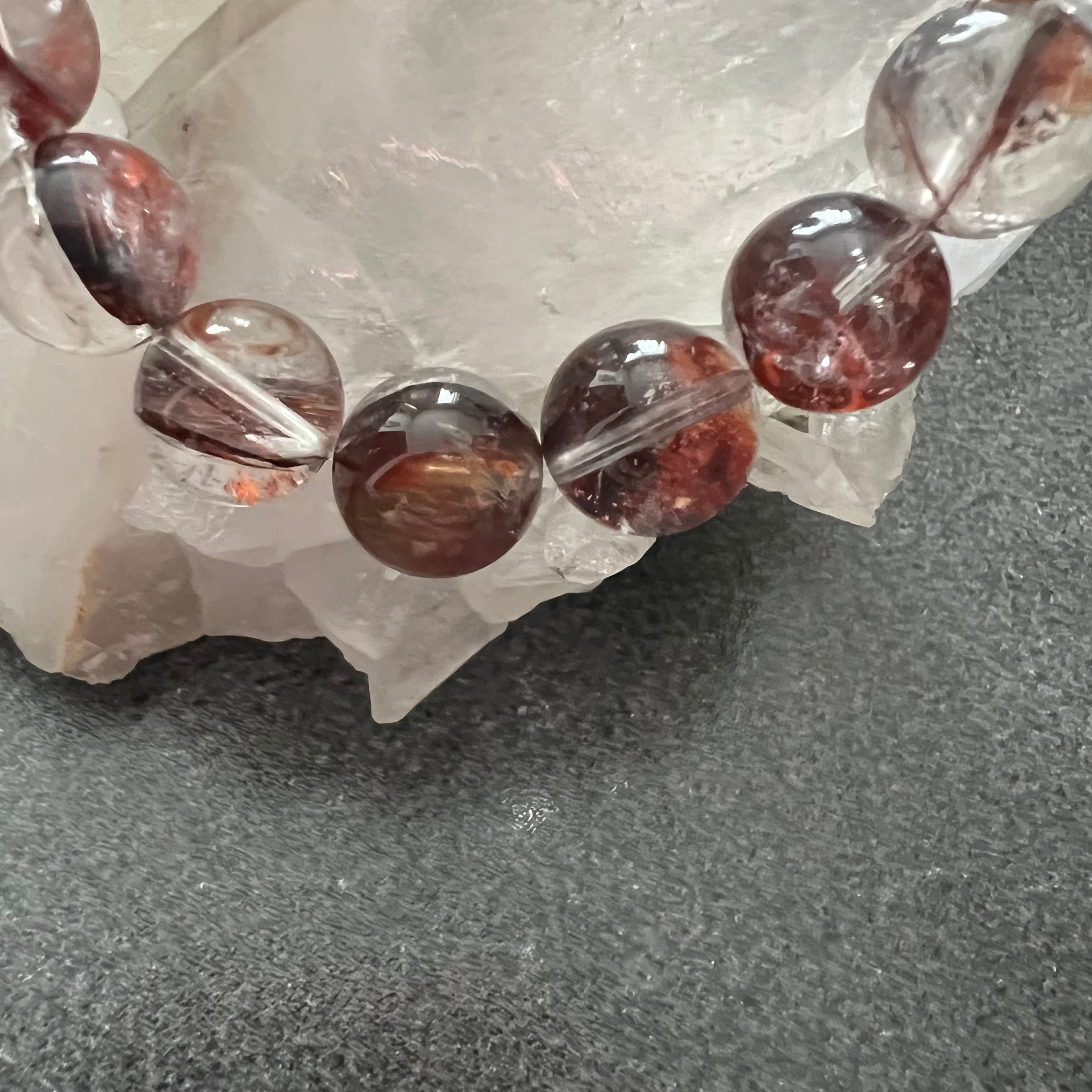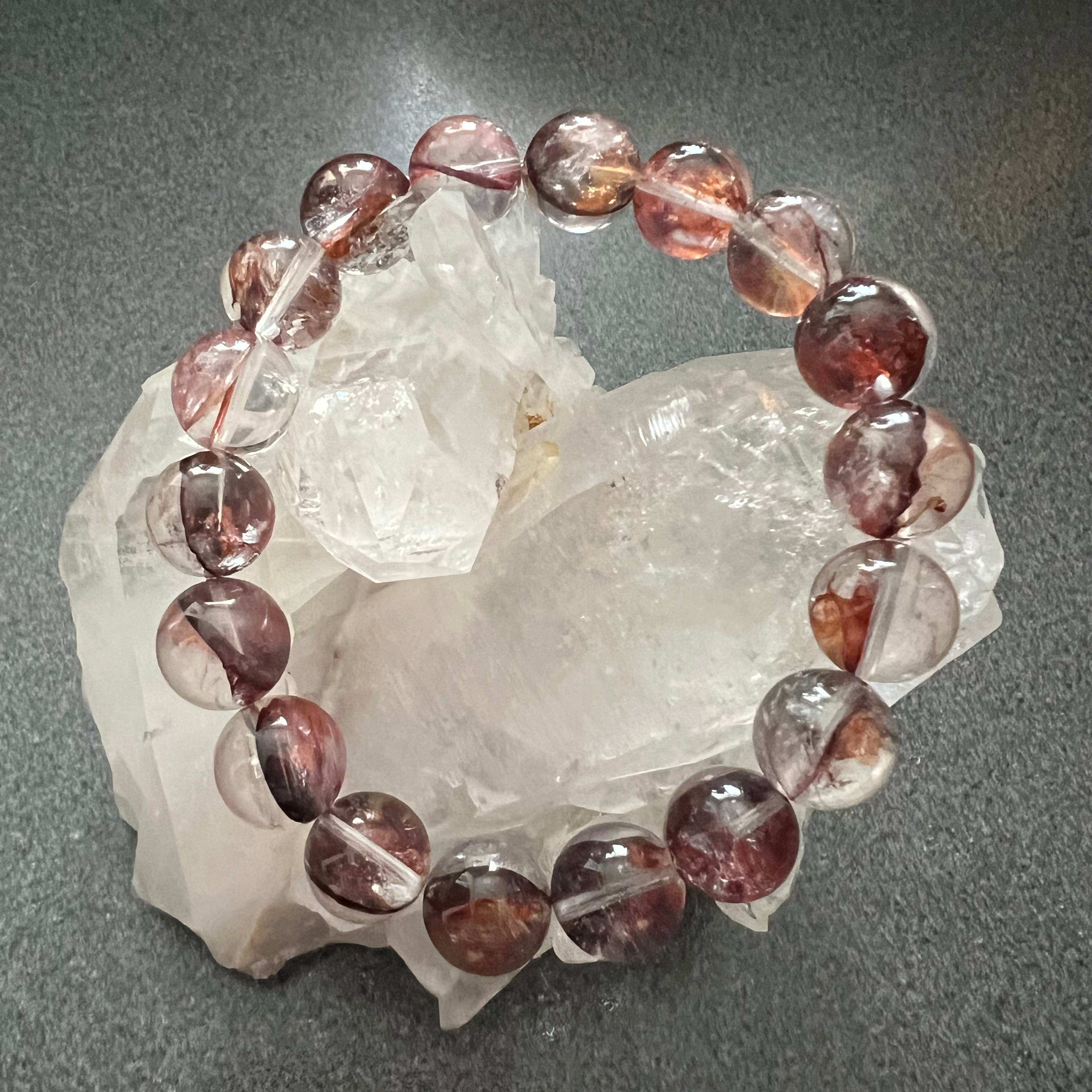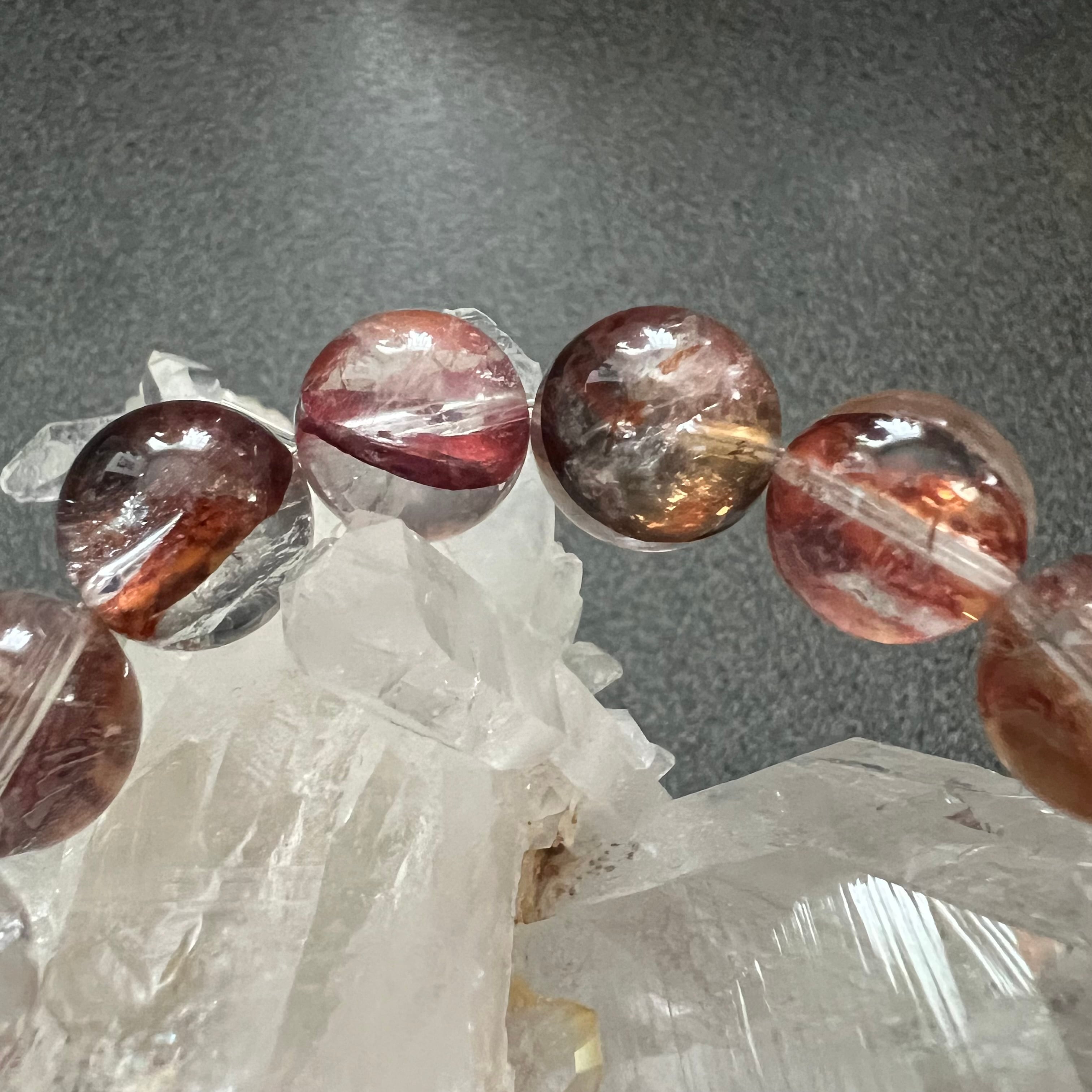 水晶の中にリモナイト(褐鉄鉱)やヘマタイトが浸透し、赤や黄色がオーロラのように輝き、金魚が泳ぐような鮮やかな色合いは、眺めているだけでも明るい気分になれます。